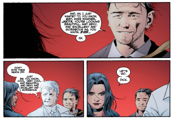 Night on Earth, we find the three predominant Planetary field agents working a case that brings them to none other than their universe's version of Gotham City. In the first few pages, we're even treated to a humorous encounter with alternate dimensional iterations of two major characters in the Batman mythos - Dick Grayson and The Joker, who are both working as staff for Planetary's Gotham bureau. Right away, the book does a fine job of blending low-brow comedy with a deadpan serious procedural, as the awkward Grayson and gleeful "Jasper" inform them and the reader of their current case. Planetary is hunting an individual named John Black, responsible for several murders within Gotham due to a mysterious metahuman ability.